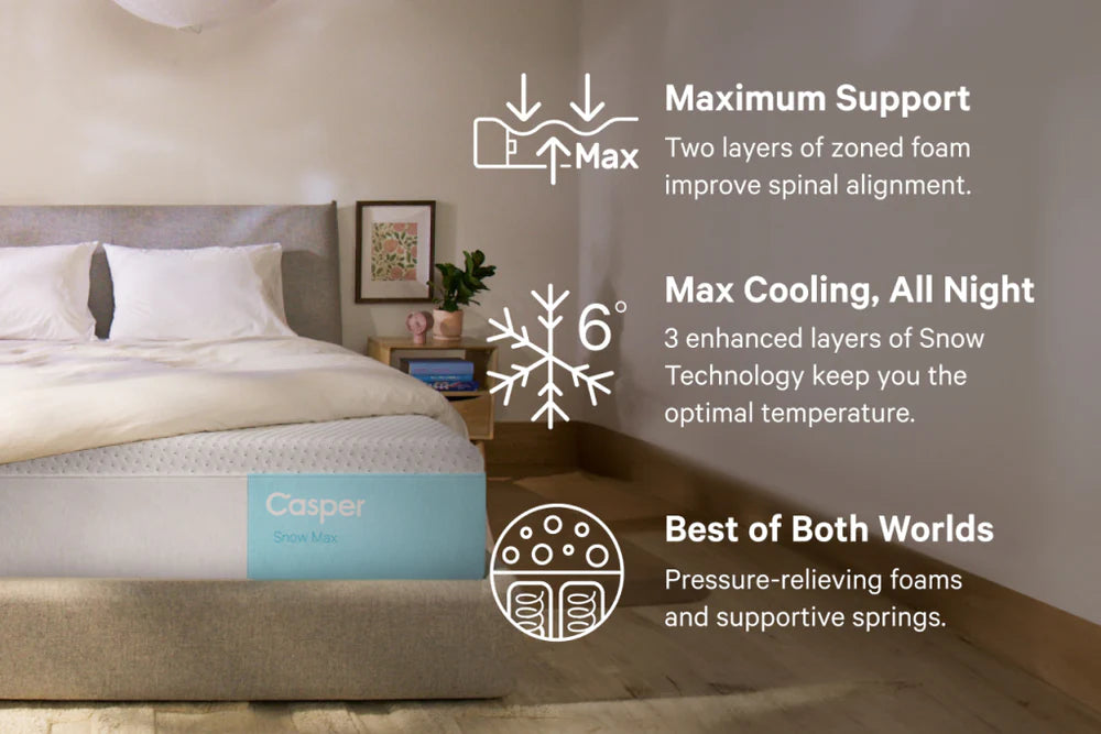 Experience unparalleled support and cooling with the Casper Snow Max mattress. This advanced hybrid design integrates cutting-edge cooling technology to maintain an optimal sleep temperature throughout the night. Engineered for a conforming feel, it adapts seamlessly to all sleep positions and addresses common sleep challenges, ensuring restorative rest and enhanced comfort. Ideal for those seeking expert-level sleep solutions, the Snow Max delivers deep, refreshing sleep every night.