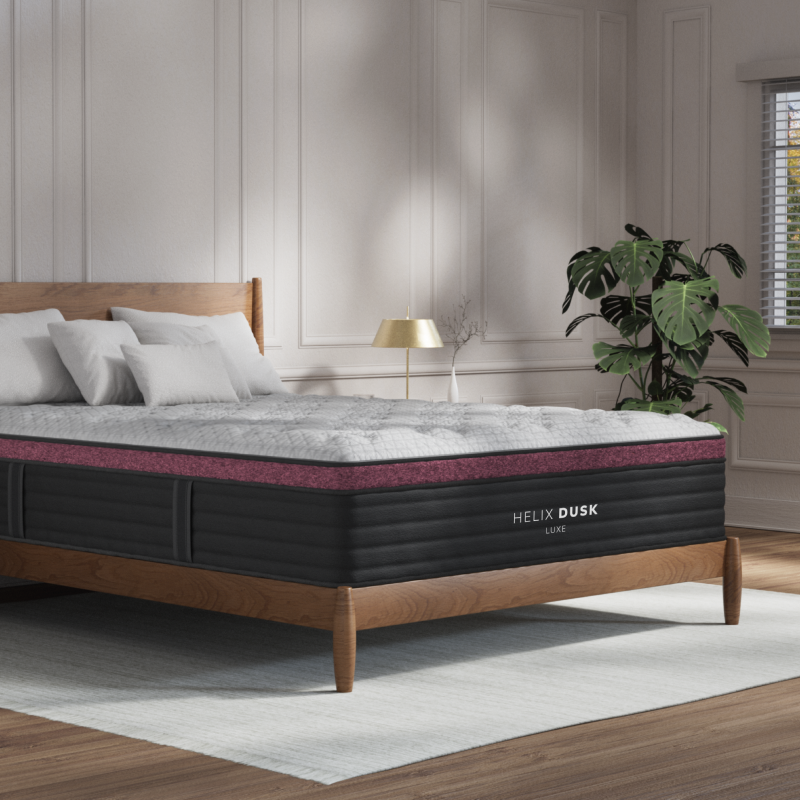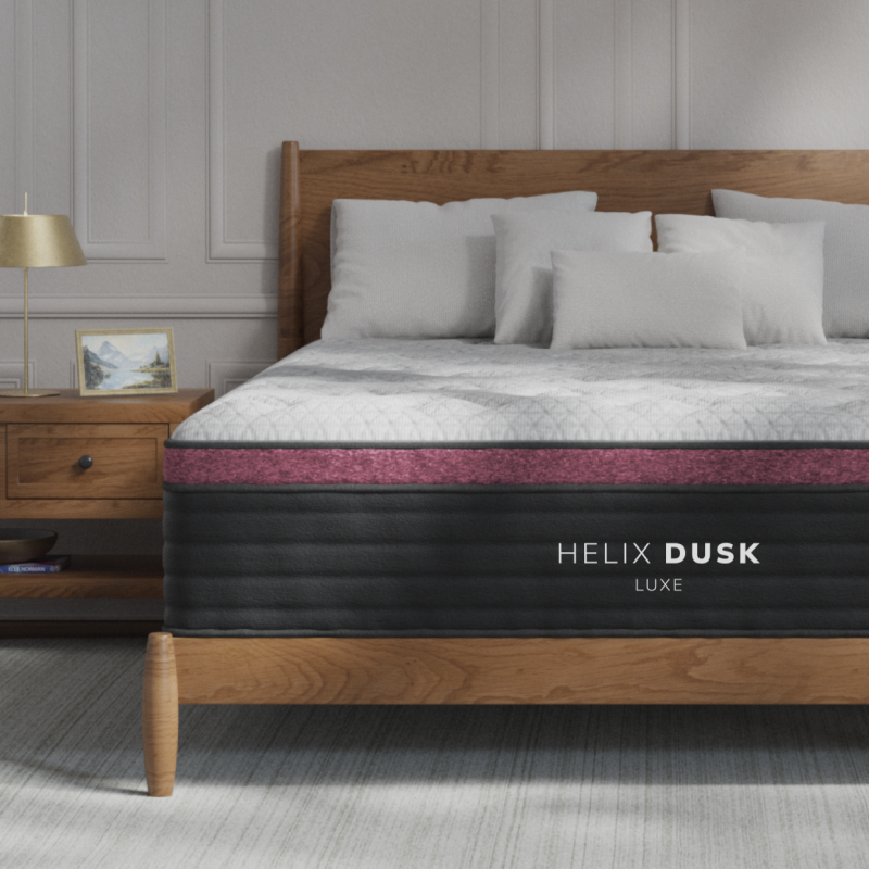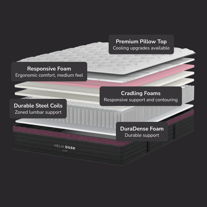 - Cover: Helix Dusk Luxe offers two covers: standard Tencel for breathability, and an optional GlacioTex™ cooling cover for $250, providing a cool-to-the-touch feel.