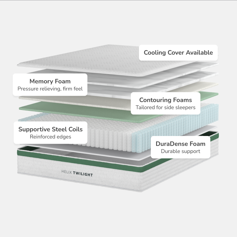 The Helix Twilight mattress, designed for superior pain relief, is a firm and custom-built sleep solution tailored to individual sleep