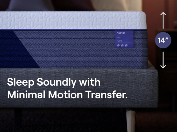 The Nectar Luxe Hybrid Mattress offers superior cooling and pressure relief with its advanced design. With over double the cooling fibers and triple the memory foam, you'll experience unparalleled comfort and temperature regulation. Enhanced edge support, motion control, and airflow from individually-wrapped coils make for a truly luxurious sleeping experience.